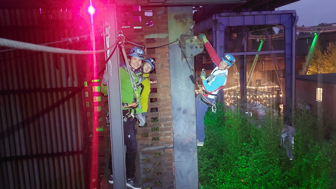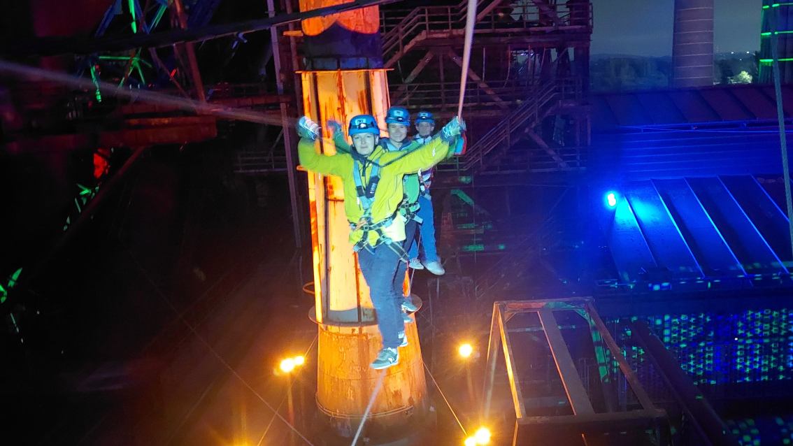 Expedition eXtrem by night beinhaltet alle verfügbaren Elemente des Hochseilparcours im Landschaftspark, ist übersetzt die „extended version“ der Expedition Stahl, da wir sehr viele Elemente haben, die wir in unserem „normalen“ Programm zeitlich nicht unter bekommen. Euer Team besteht aus 10-15 Teilnehmern und 2 unserer Trainer. Nach der Einweisung in die Sicherheit und Technik unseres Parcours geht es über unterschiedlichste Elemente zunächst kreuz und quer durch die Gießhalle II, bis wir den Hochofen erreichen und in die höheren Elemente zwischen und an den Öfen einsteigen. Hier schraubt sich der Weg bis ganz nach oben, quer von einem Hochofen zum Anderen, um zum Schluss in einer rasanten Abseilfahrt aus schwindelerregender Höhe am Boden zu enden.