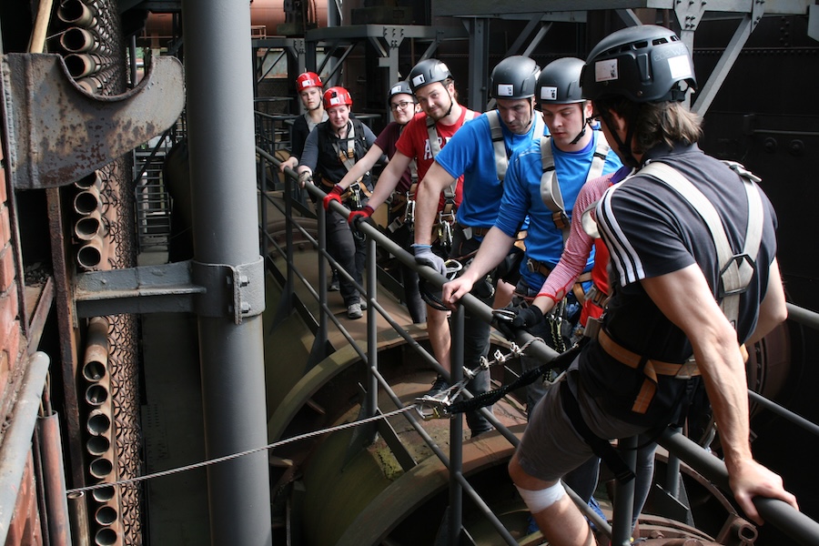 Mit niedrigen Elementen angefangen, gewöhnen wir uns Stück für Stück an die Höhe und schrauben uns in der ehemaligen Gießhalle bis unter die Hallendecke. Dann geht es nach draußen und damit immer weiter hinauf zum Highlight, der Steelroad in 50 Metern Höhe. Hier erleben wir den Ausblick über das halbe Ruhrgebiet, bevor wir in rasanter Abseilfahrt wieder den Boden erreichen.